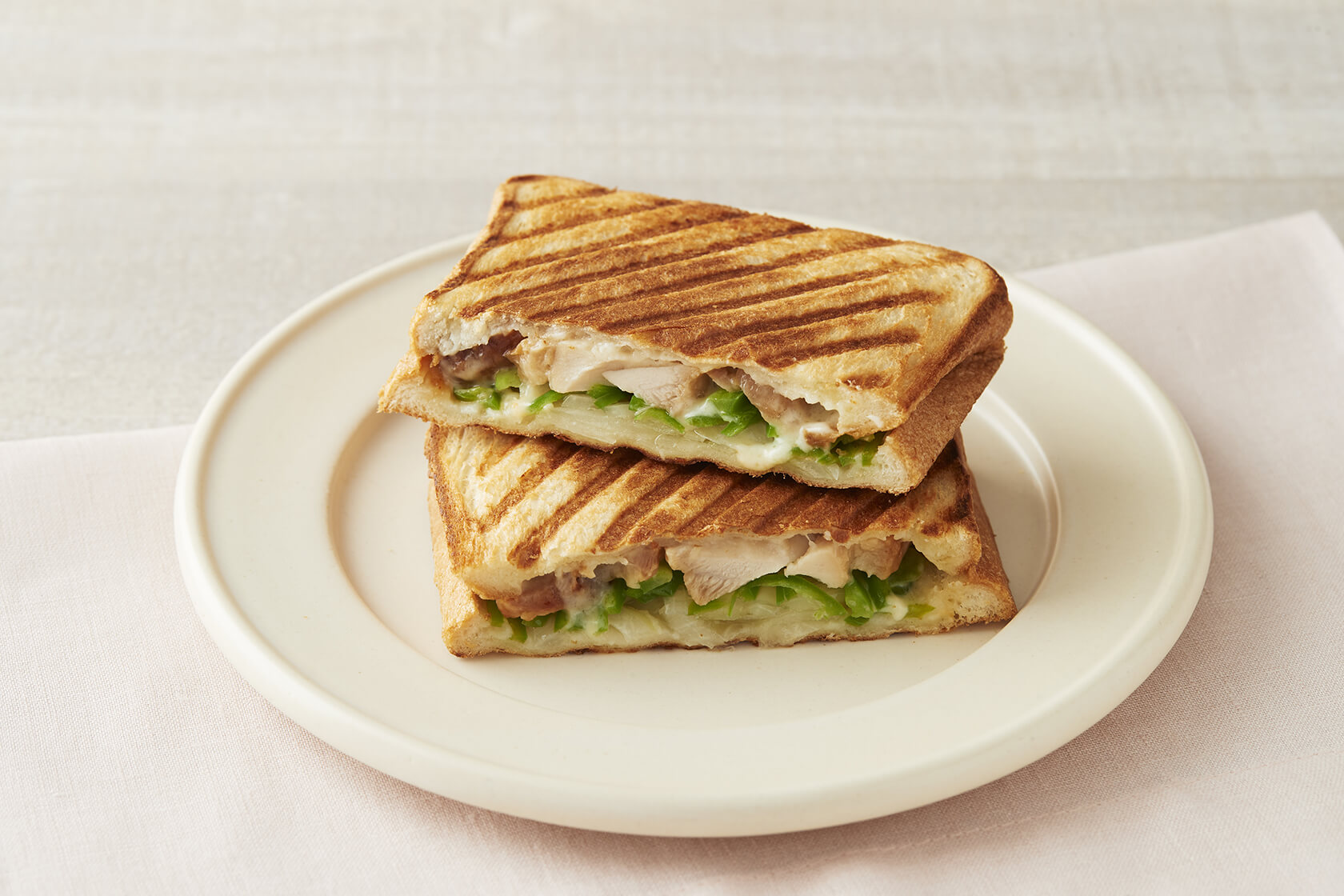 ③ホットサンドメーカーに、バターを塗った面を上にして食パン1枚を置き、玉ねぎ、ピーマン、照り焼きチキン、「CO・OPとろけるスライスチーズ」の順に重ね、上から食パンをもう1枚重ねて焼く。