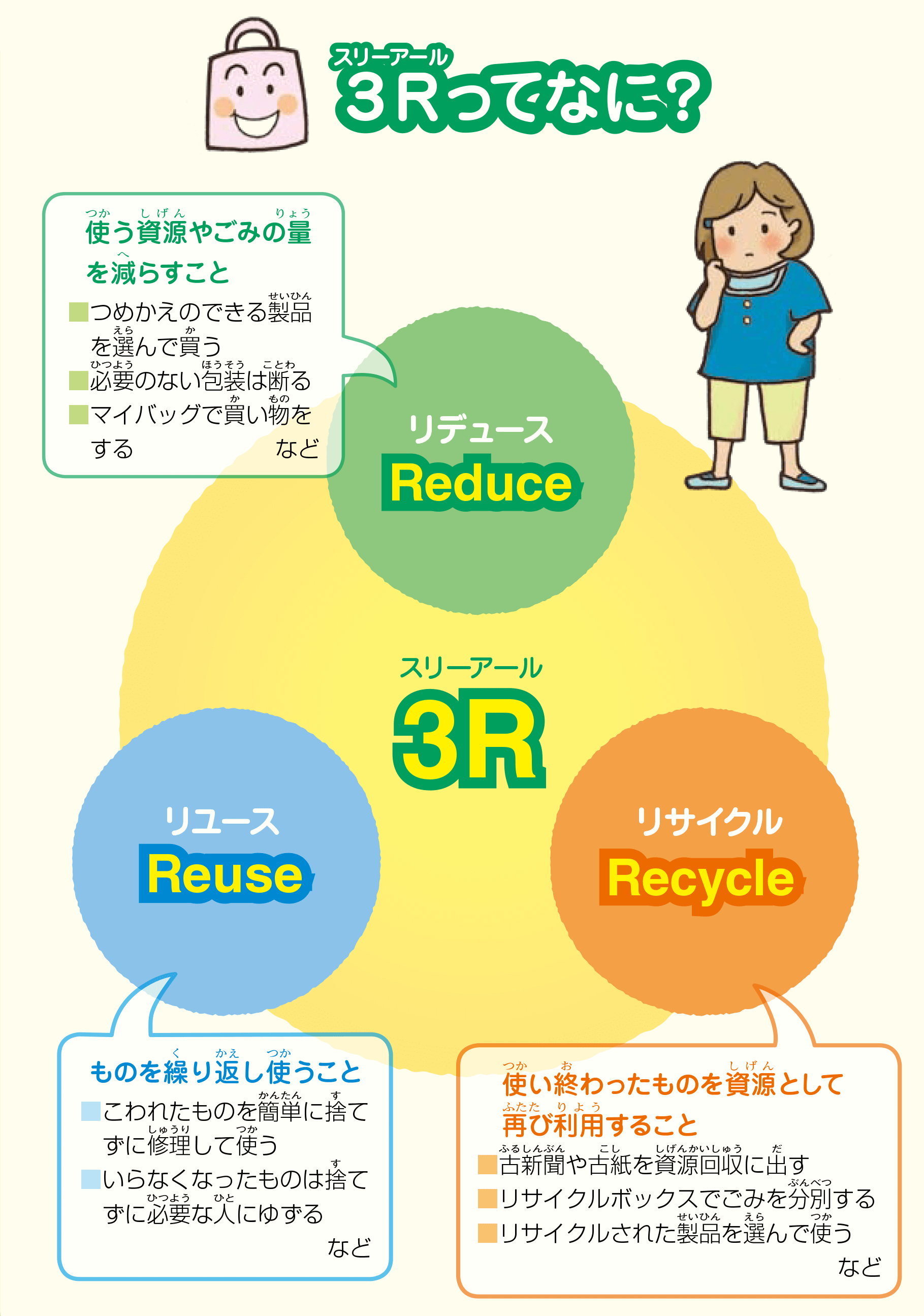 3Rというのは、「リデュース(Reduce=ごみの発生抑制)」「リユース(Reuse=再使用)」「リサイクル(Recycle=再資源化)」の頭文字をとったものだよ。この順で優先順位が高く、まずはリデュースでつかう資源やごみの発生をおさえることが大事なの。 最近は3Rのなかから「リフューズ(Refuse=ごみになるものを買わない)」と「リペア(Repair=修理して使う)」を取り出して、3Rに加えて「5R」という場合もあるよ。