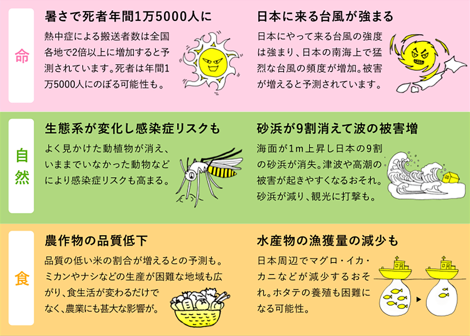 このような世界になると、みなさんの家族や友達のくらし、みなさんが好きな食べ物やスポーツはどうなるでしょうか。みなさんがすんでいる街はどうなるでしょうか。想像してみてください。
