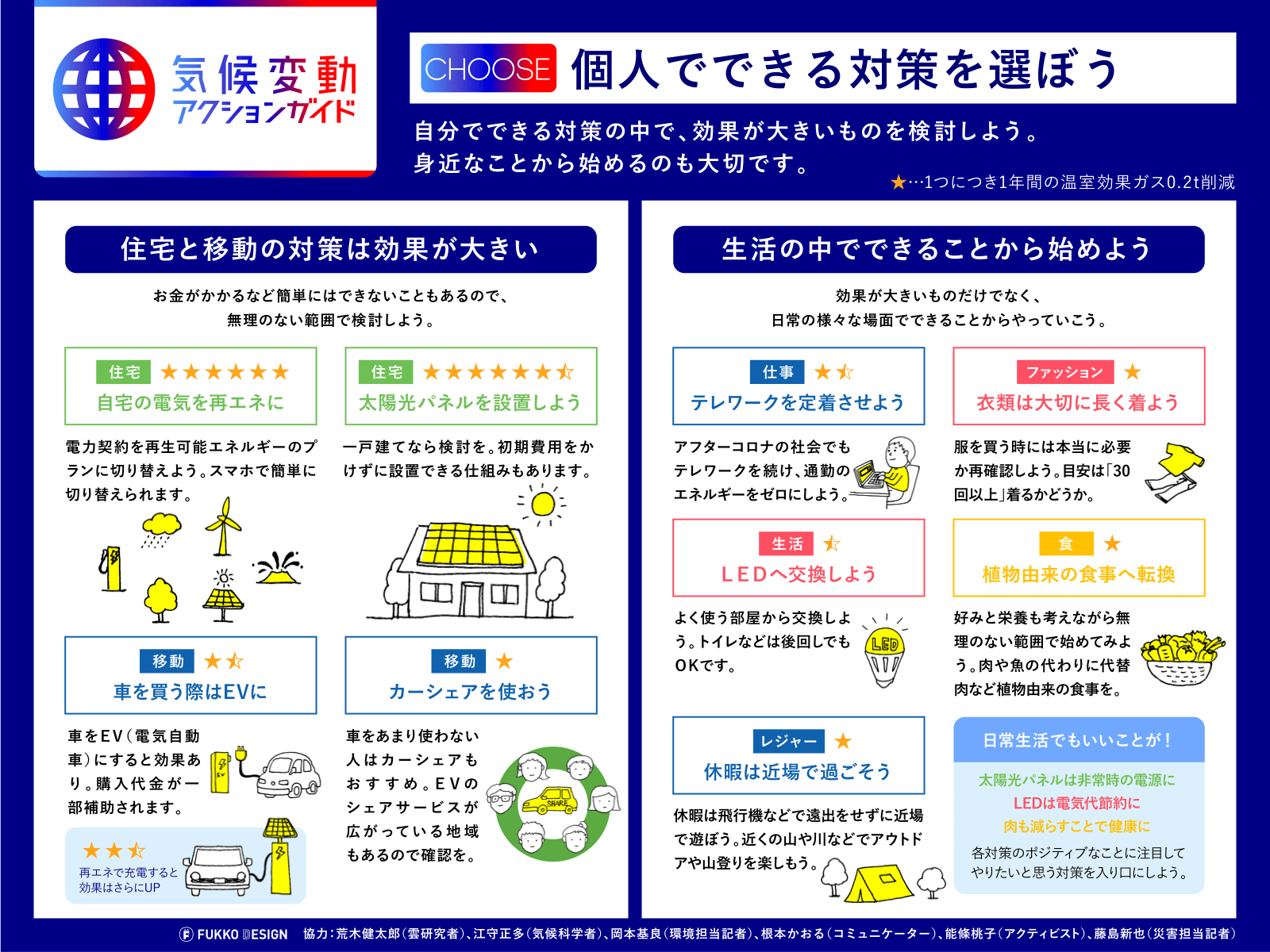 自分の生活のどこから二酸化炭素が多く出ているのかわかったら、それをへらすための行動をしましょう。「気候変動アクションガイド」も参考になります。